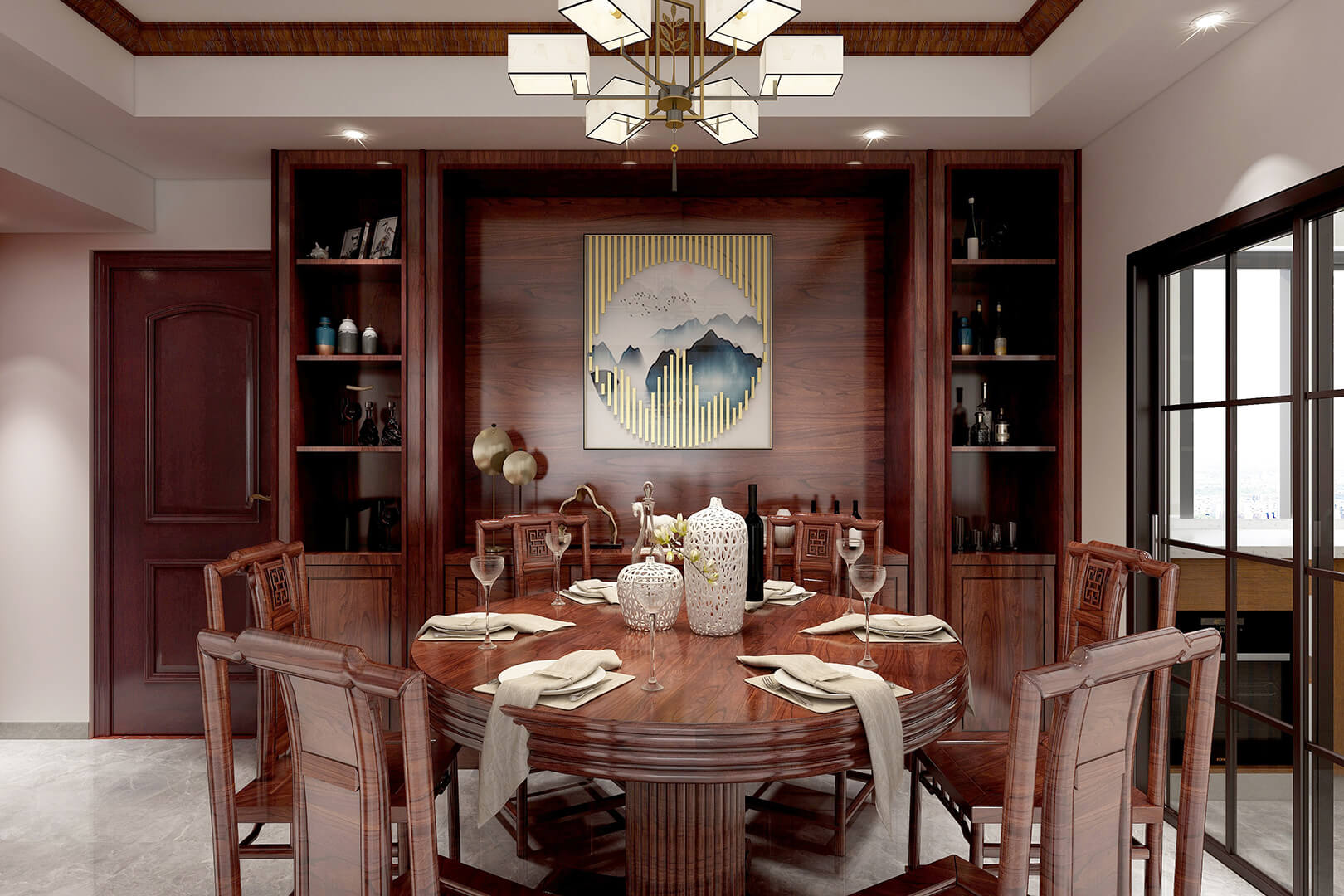 本案户型为:5房2厅3卫,总面积121㎡。素雅的空间背景,端庄大气的木系家具,呈现出雅致的特色,中式元素的装饰给人带来自然古雅的视觉效果,整体空间给人宁静致远的感觉。