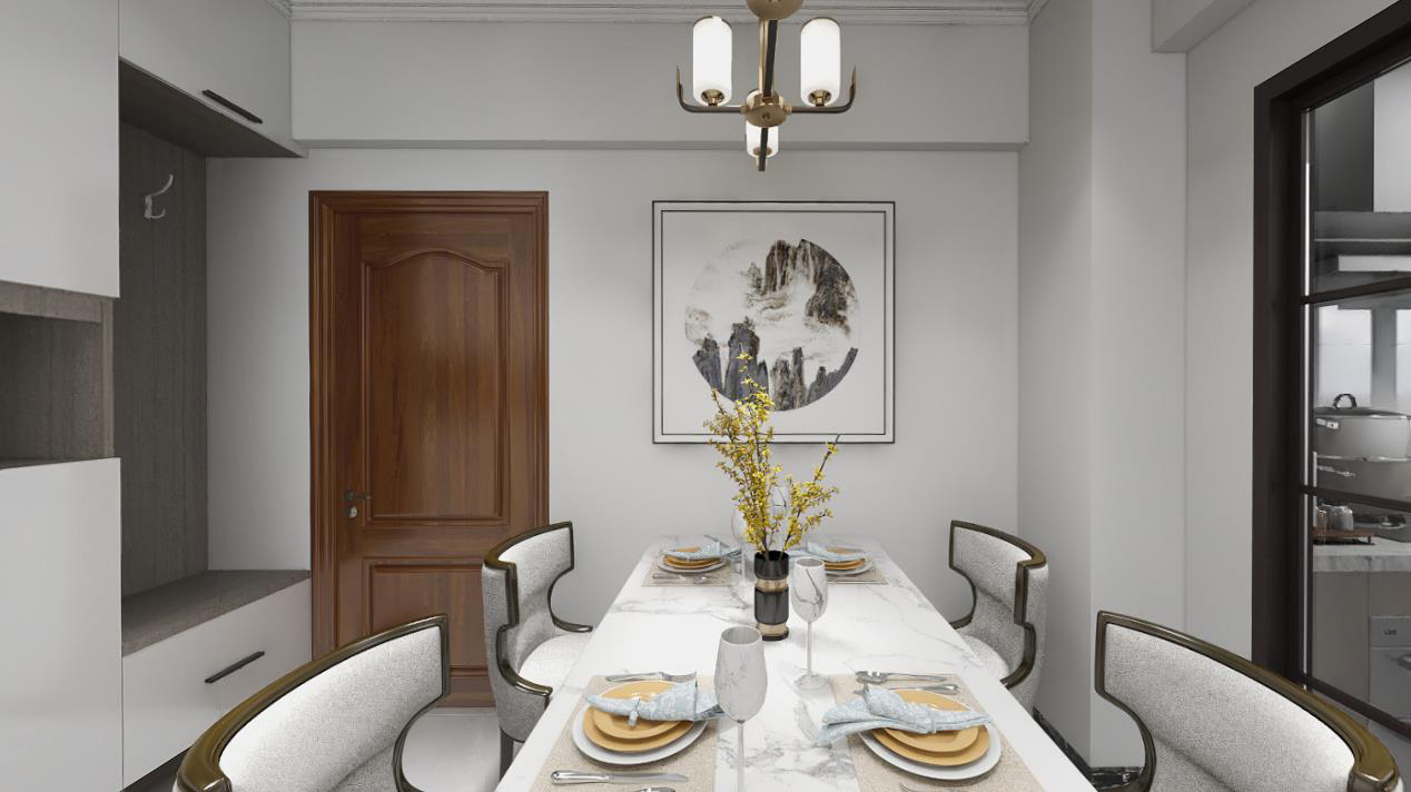 本案户型为:3房2厅2卫,总面积72㎡。本案风格为新中式,在空间中以浅灰色为主色调,将中式元素以生活的面目表达出来。在造型、摆件等上面采用一些中式手法,为空间增添高雅秀逸的意境美,使得整体空间赏心悦目,并充满韵味。