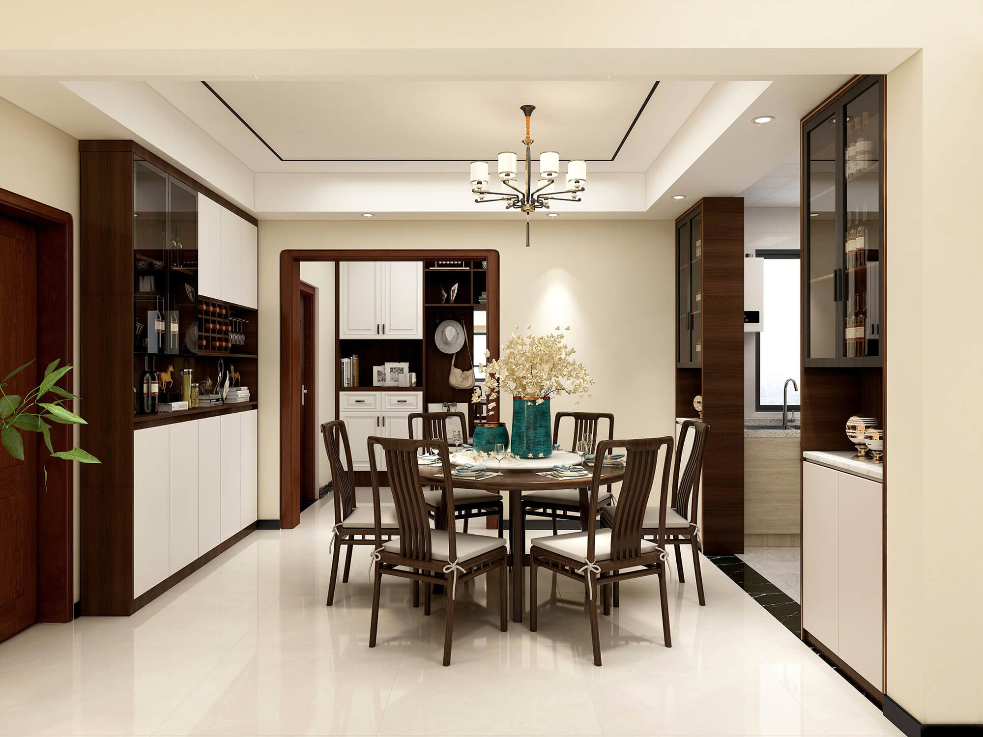本案户型为:4房2厅2卫,总面积143㎡。富有韵味的中式元素,在纯粹洁净的空间色调中,不断映衬古韵的柔和禅韵。返璞归真,将一份豁达与悠然的心境赋予其中,传递居住者对静与雅的追逐。现代摆件的点缀,为整个空间增添现代感。