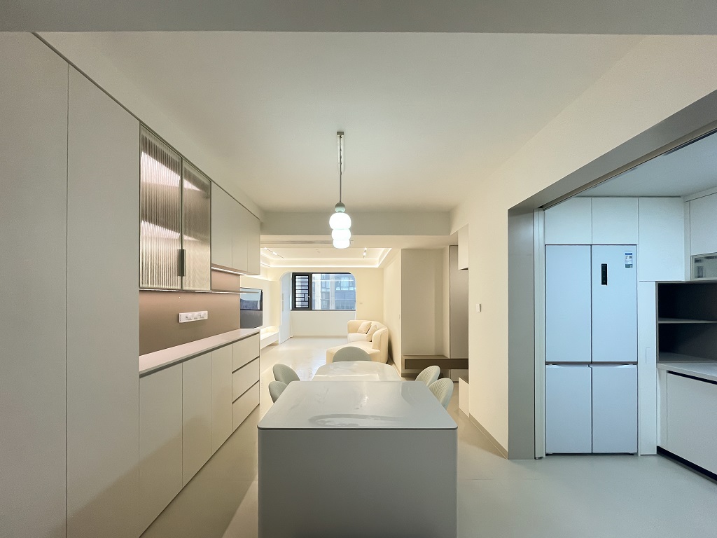 空间整体奶白色调装饰,耶为空间带来了充沛的光线,设计师整体结构上不设明显的界定,在装修次材料、色彩搭配上逐步描述空间的构成关系。